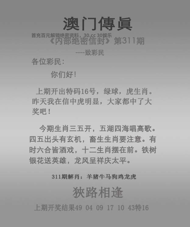 314期挂牌【裁书叙心】 解释:通过书写信件解书肖龙马虎,挂:04 爆:羊。 综合:虎羊马龙狗鸡猪 |